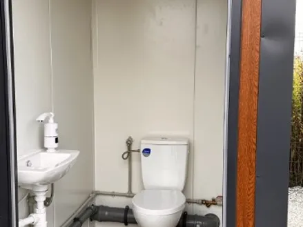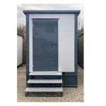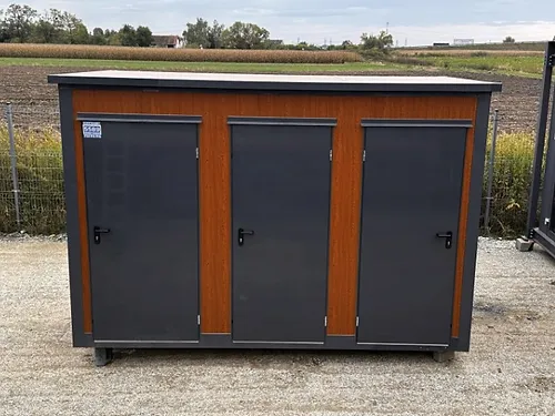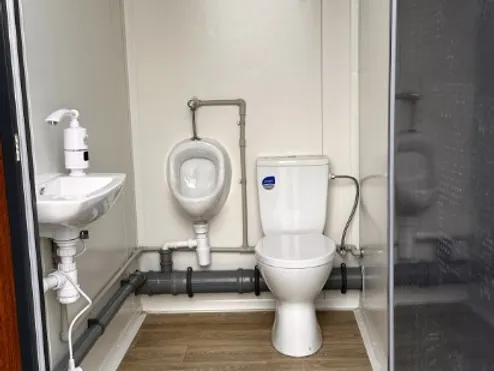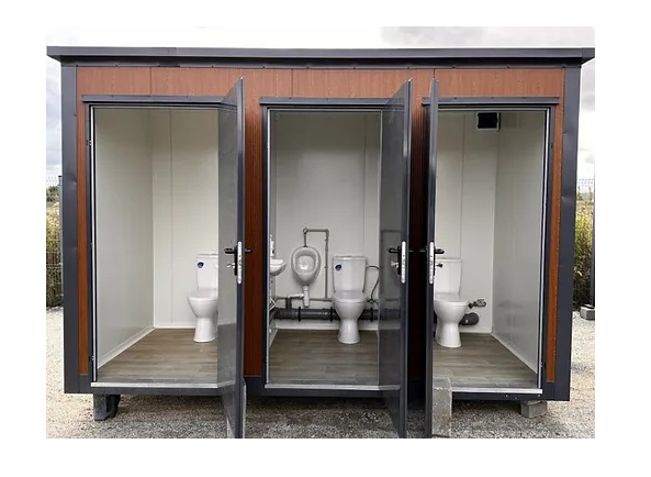 Contenedor sanitario tipo pabellón, equipado con tres cabinas independientes: